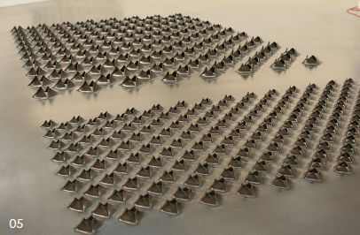 在莫娜.哈透姆的世界里,熟悉的物体通过外观规模上的变异和夸张,完成了视觉冲击赋予的心理方面的质变,从而使作品兼 具诱惑性与危险性的特质。一个晶莹剔透的星相图构成了《网》(Web,2006),其网状结构延伸在整个UCCA中央甬道,在视觉上吸引观众的同时,它其实借用了蜘蛛网陷阱的形状。两件2008年 新作《屏风》(Paravent)和《睡觉中》(Dormiente)的原型均为厨具刨刀,放大后分别变形为屏风和床。但它们锋利的边缘仍在警告每一位试图碰触它们的人。2006年完成的作品《提灯》(以阿拉伯语中的同义单词命名,Misbah),将游移的星星和士兵投影在一间 暗房。作品《静物:手雷》(Nature morte aux grenades)中运用的糖果色彩的球状物,其形状与玻璃手榴弹极其相似。《潜流》(红)(Undercurrent (red), 2006-2007)中跳动发光的灯泡和触手般肆意卷曲的电线,意在呈现某些生物拥有的潜在邪恶力量。
