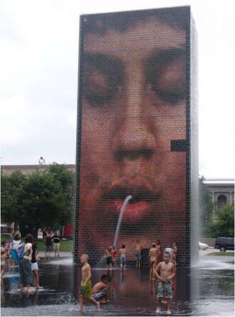 跟芝加哥 人生活息息相关的公共艺术作品——由西班牙艺术家普莱策(Jaume Plensa)设计的喷泉与影像幕墙结合的构筑体,露天广场的皇冠喷泉(Crown Fountain)。
